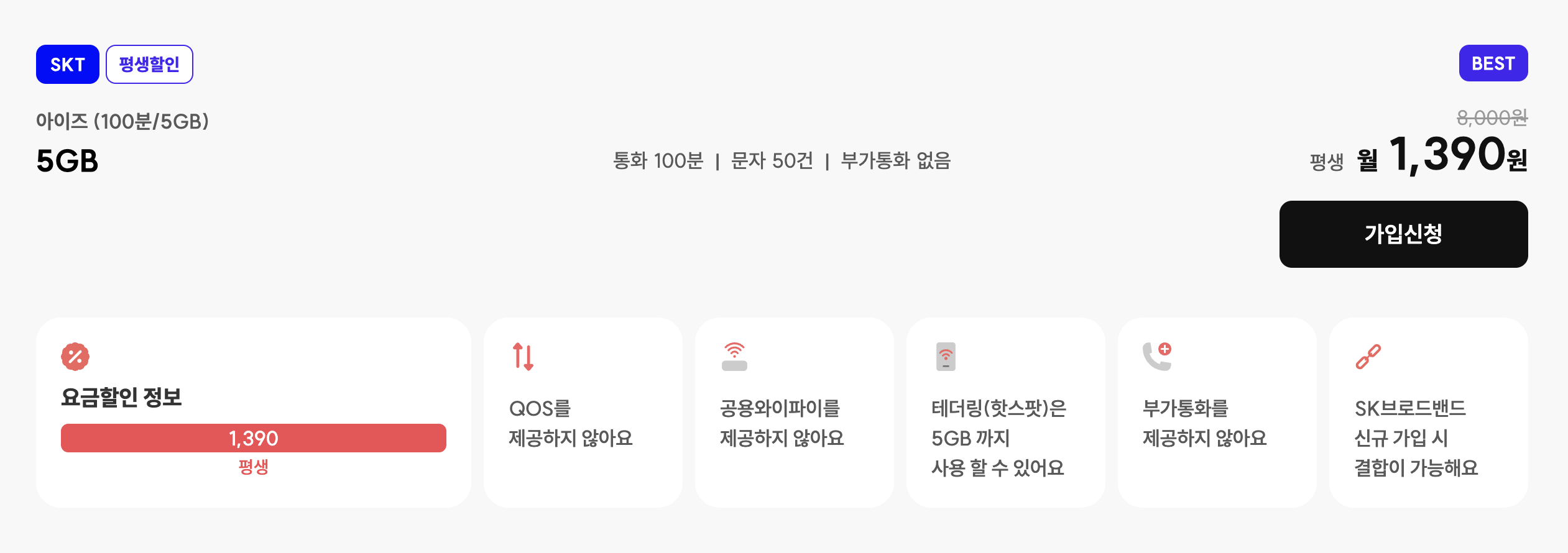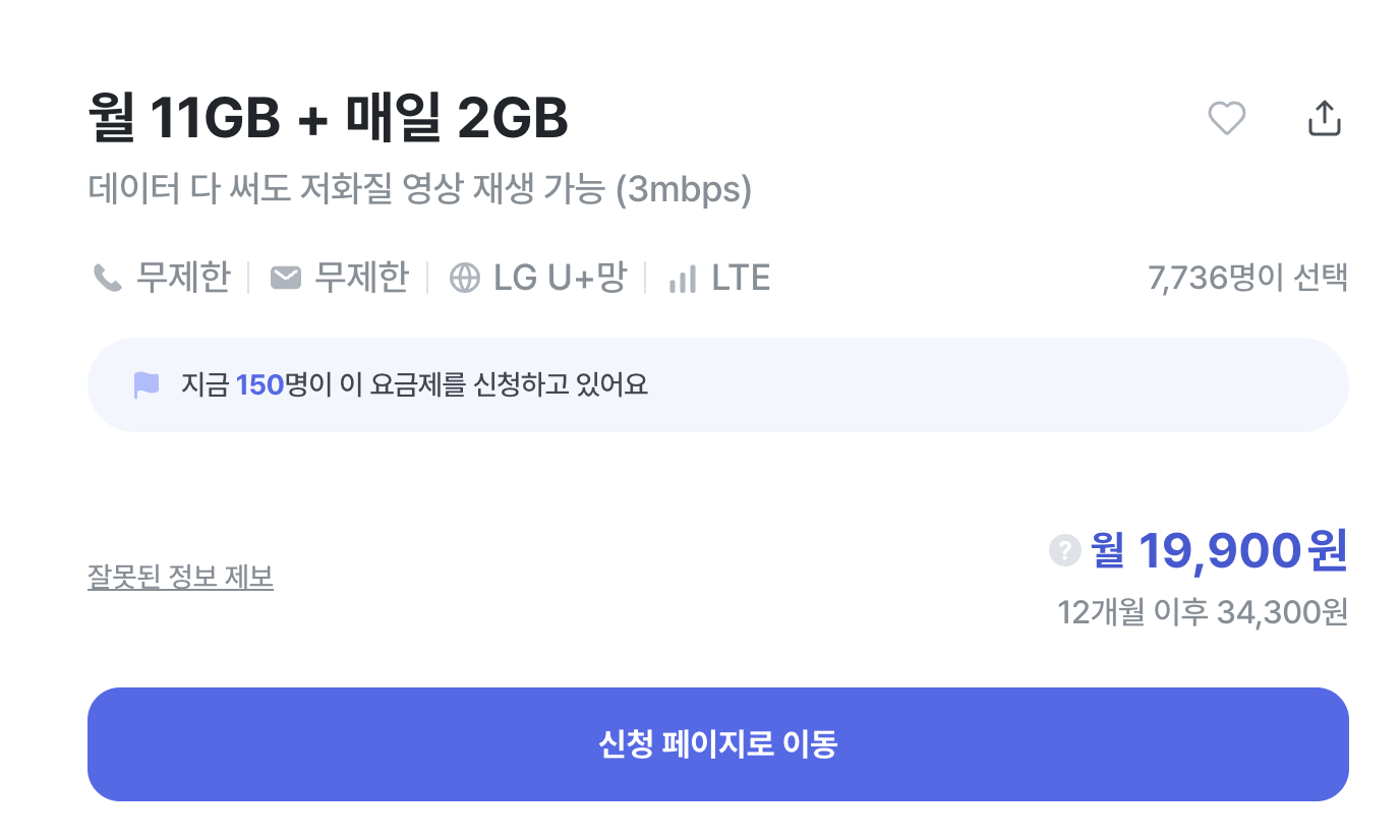 일단 내가 가입한 요금제이다. 해외에서 한국들어올 때 사용하려고 가입했고, 신규개통이라 유심비 안받는다(고 안내는 봤었는데 아직 청구서가 안나와서 봐야할 듯). 지금은 1,390원이고 내가 가입할 때는 1,290원이었다. 100원 오르기했지만 1,390원으로 5GB와 100분 통화랑을 보장받을 수 있다면 부담없이 가입할 수 있다는 게 큰 장점이다. 가입하고 사용하지 않아도 되지 않을까싶다.