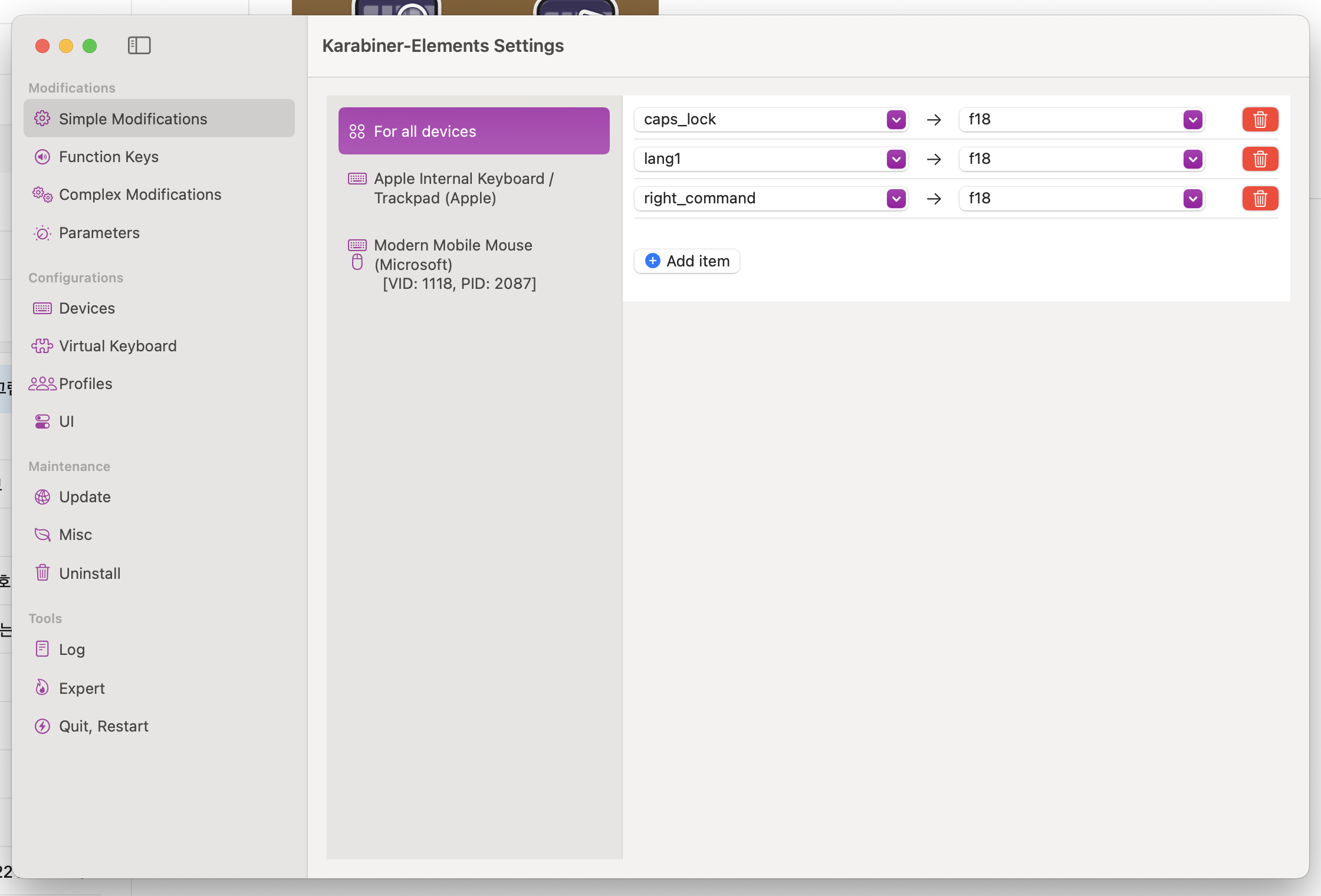 karabiner 설정에 들어가서 위의 캡처화면처럼 모두 f18, 즉 오른쪽 커맨드키로 변경해준다. 그러면 놀랍게도 지긋지긋했던 커맨드키로 한영을 쉽게 할 수 있다! 다른 것도 뭐 건드렸는지는 기억이 안나지만 지금도 이렇게만 설정해주면 쉽게 한영키를 설정할 수 있다 .