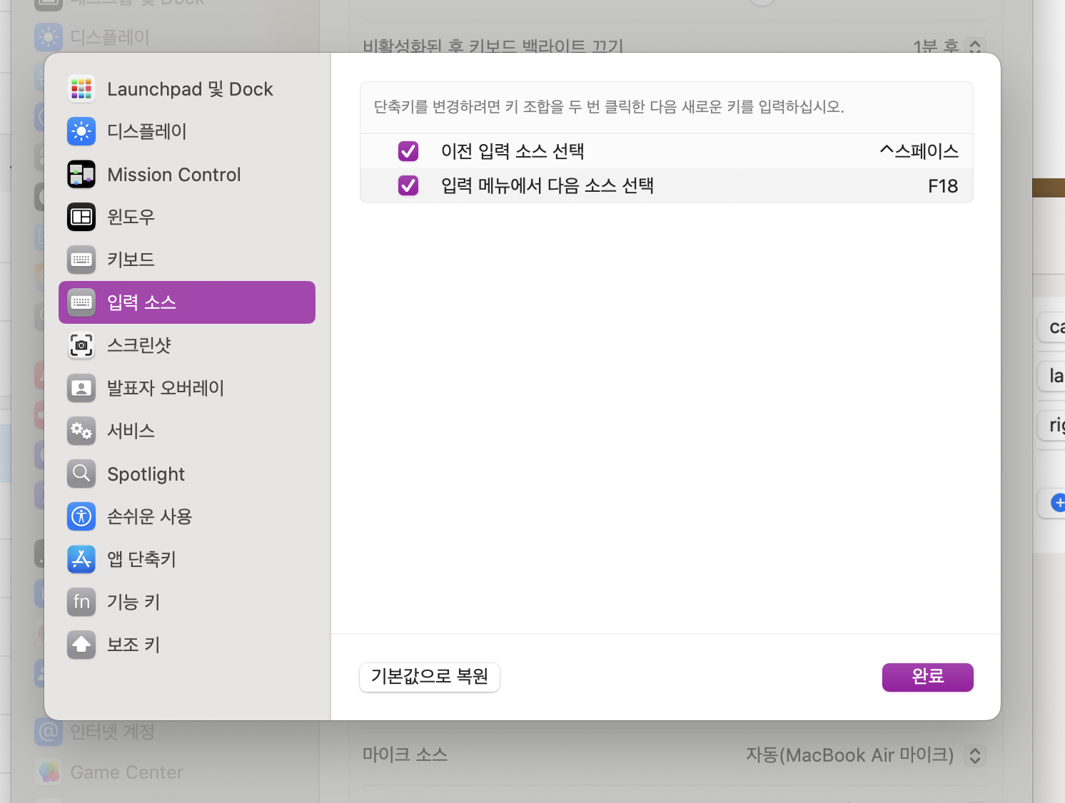 설정 - 키보드 - 키보드 단축기 - 입력소스에 들어가면 위와 같은 화면이 뜬다. 이 때 '입력 메뉴에서 다음 소스 선택'을 클릭한 후 키보드의 '오른쪽 커맨드'를 선택하면 위와 같이 F18로 뜰 것이다. 예전에 이거 내가할 때 개고생했던건데, 아무리 뭘해도 변경할 수 없었다. 그 때는 심호흡을 한번하고 위의 캡처화면에서 위에 'F18'이라고 되어 있는 곳을 클릭하자. 그러면 변경할 수 있도록 커서가 변경될 것이다.