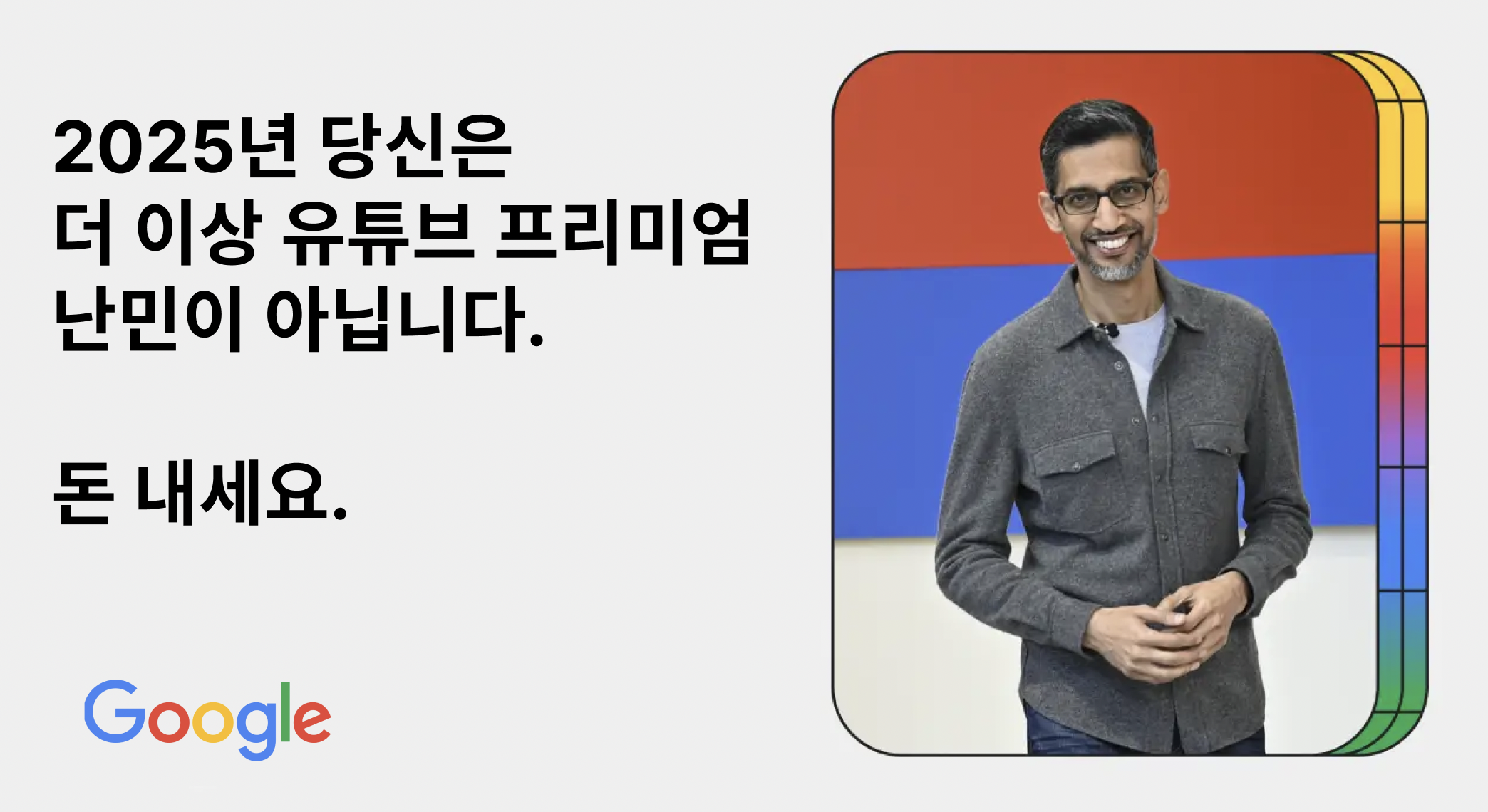 지난 2024년 11월부터 유튜브 프리미엄을 우회하여 이민살이하던 전세계 사람들에게 구글이 "더 이상은 안된다"라는 포고령을 내렸다. 내가 처음 인지한 것은 "다음 동영상부터는 광고가 나올지도 몰라요"라는 메세지였고, 이후로 등록되어 있는 카드로 갱신이 되지 않았다. (vpn도 소용없었다). VPN으로 인도로 바꿔도 결국 결제수단 단계에서 현지 결제수단, 즉 인도 현지에서 발급받은 카드가 아니면 갱신되지 않았다.