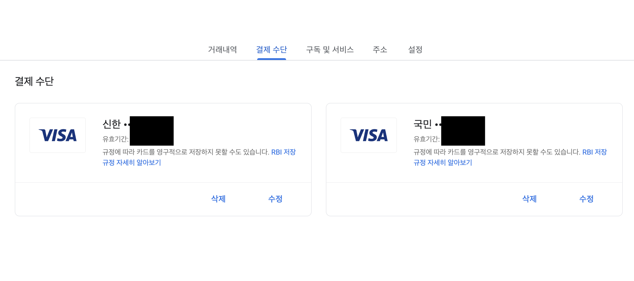 현재 내 인도 프리미엄 결제 수단 창이다. 예전부터 사용하던 계정이기 때문에 주소는 당연히 인도로 되어있지만 다른 것들은 건들거나 삭제하지 않았다. 뭐 여러분은 안될 수도 있지만 난 암튼 잘 작동하니 일단 변경없이 그냥 진행해보고 문제가 있으면 돌아와서 수정해보자