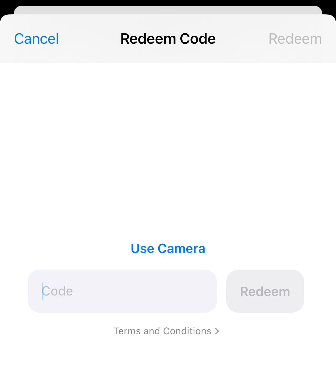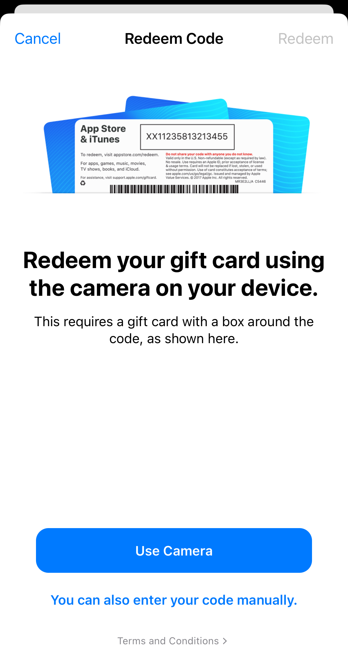 Redeem Gift Card or Code - You can also enter your code manyally - Code 순으로 창이 뜨며, 여기에 메일로 받은 결제 코드를 입력하자.