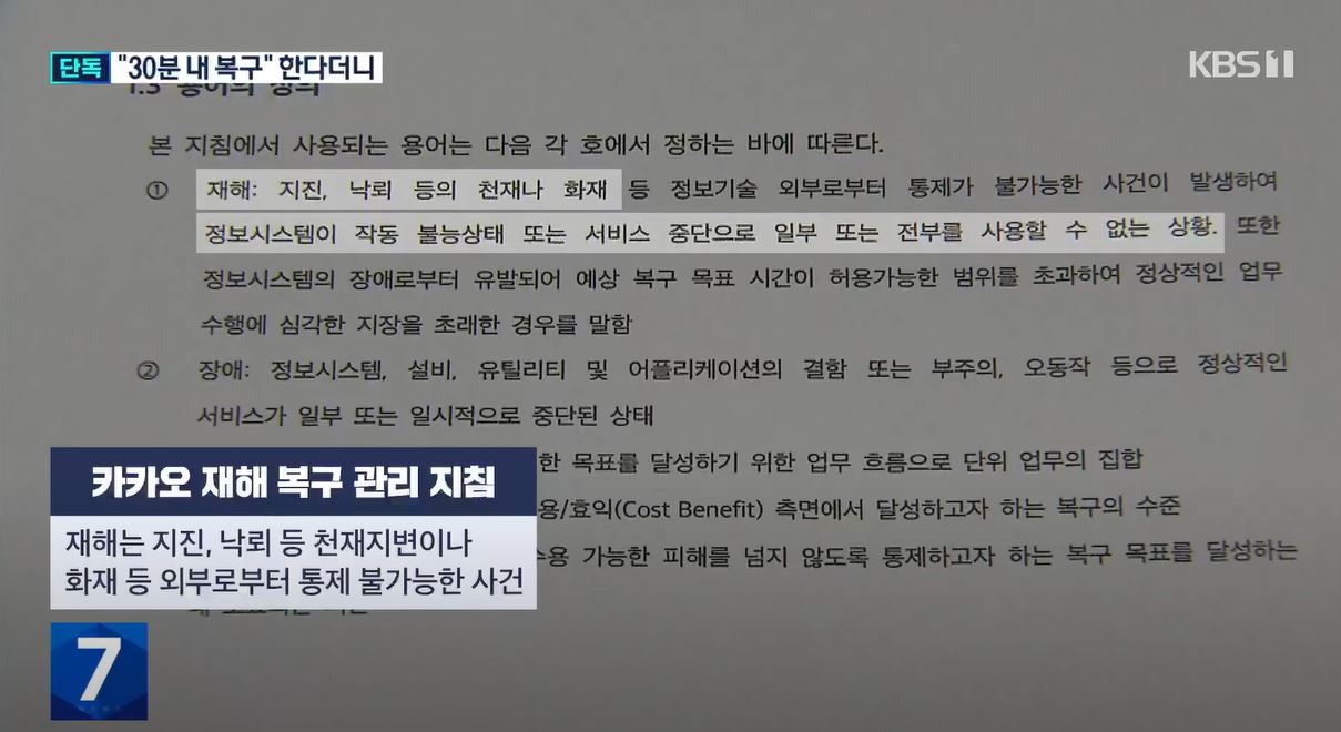 이 관리지침을 보면 카카오 부사장이 왜 화재를 "예상할 수 없는 사고"였다고 했는지 대략적으로 접근해볼 수 있다. 그분(그는 아니고 그녀라는 단어도 좀 어색하다)은 기자들과 수많은 카메라를 앞에 두고 "법리적 해석과 범위"를 이야기했다. 즉 카메라 앞에서 국민을 상대로 금융감독원이나 행정부, 주주등 이해관계자를 대상으로 하는 메세지를 전달한 것이다.
