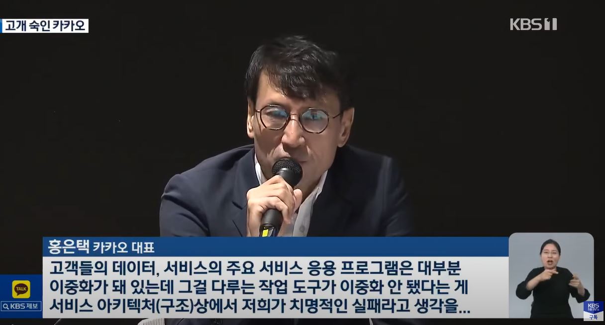 현 카카오 대표의 자기 반성은, 수많은 기자와 카메라 앞에서 국민과 여론을 향함을 동시에 전임 대표들과 주주들을 향한 "계산된, 하지만 감정적인"메시지이기도 하다. "야! 이거 전에 아키텍처 구축할 때 제대로 했어야 할 꺼 아니야!"