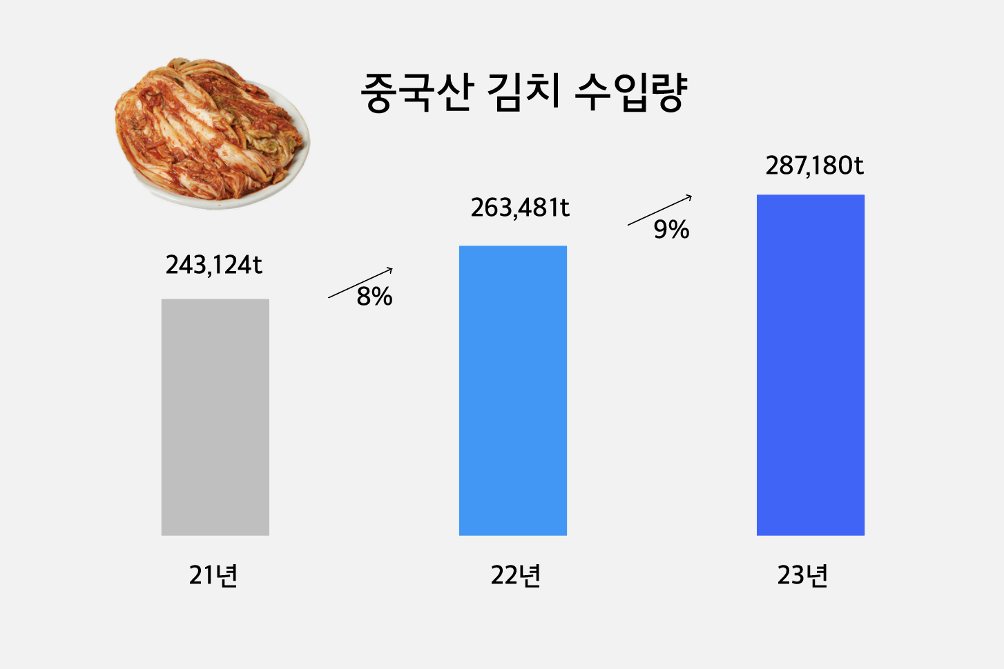 우리나라의 식품 수입국 순위는 당연히 중국이 1위고, 미국과 호주순으로 인데 이 두나라에서는 밀과 대두, 식품원료 등의 수익이 많은 편이다. 우리나라가 중국에서 가장 많이 수입 하는 식품은 김치이다. 우리나라 사람들은 이미 중국 김치 파동을 한번 겪었지만 2023년까지도 김치수입만 꾸준히 늘고 있다.